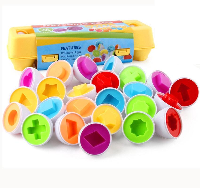 Ovos Geométricos Montessori se reúnem para exercitar a coordenação olho-mão das crianças e as habilidades de reconhecimento.