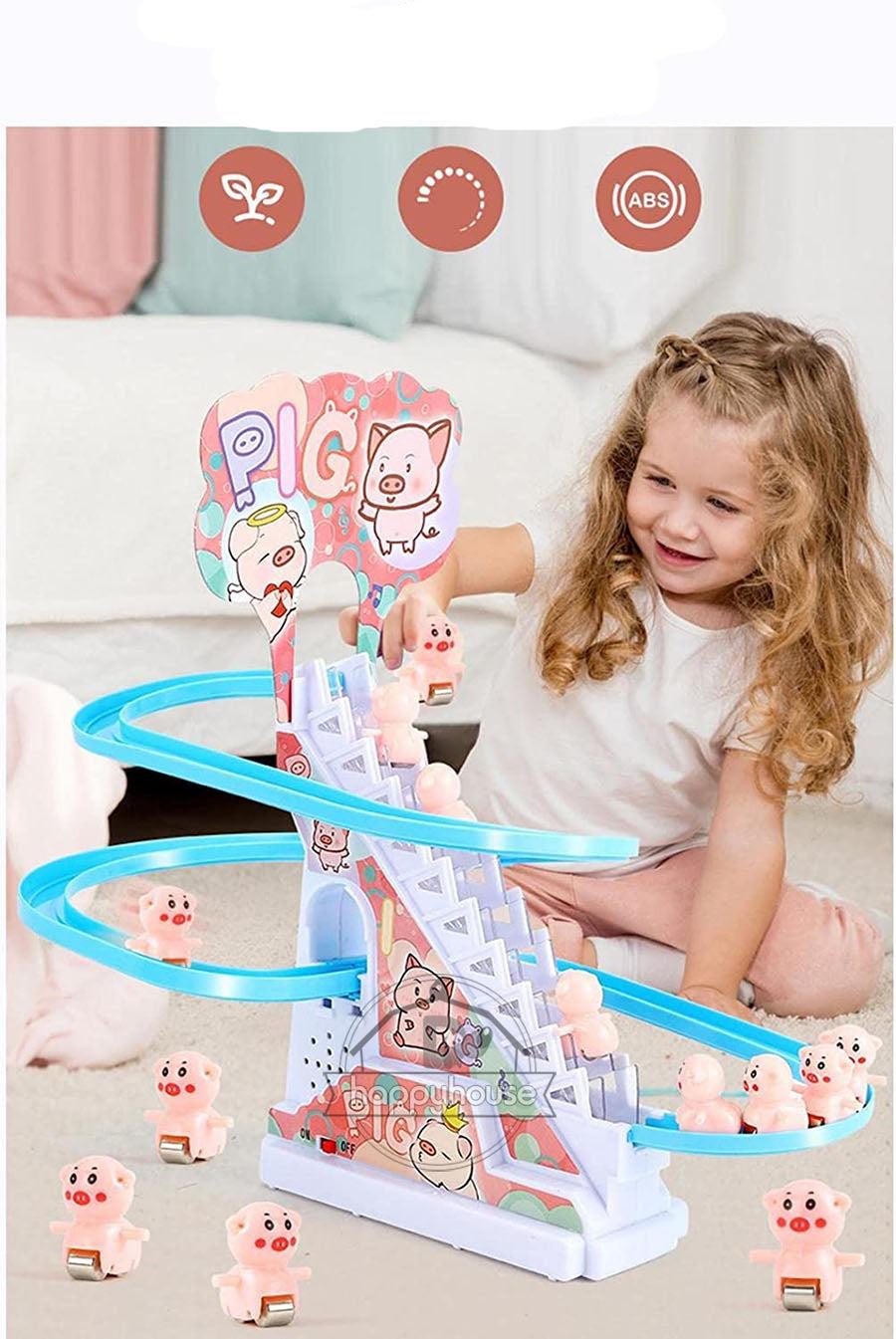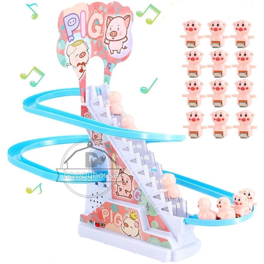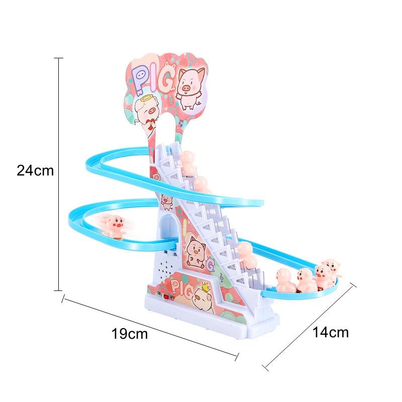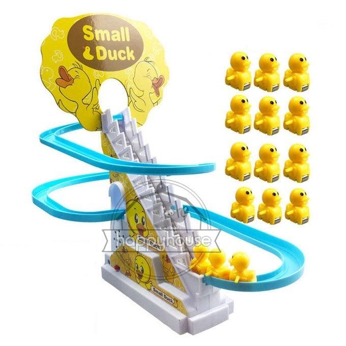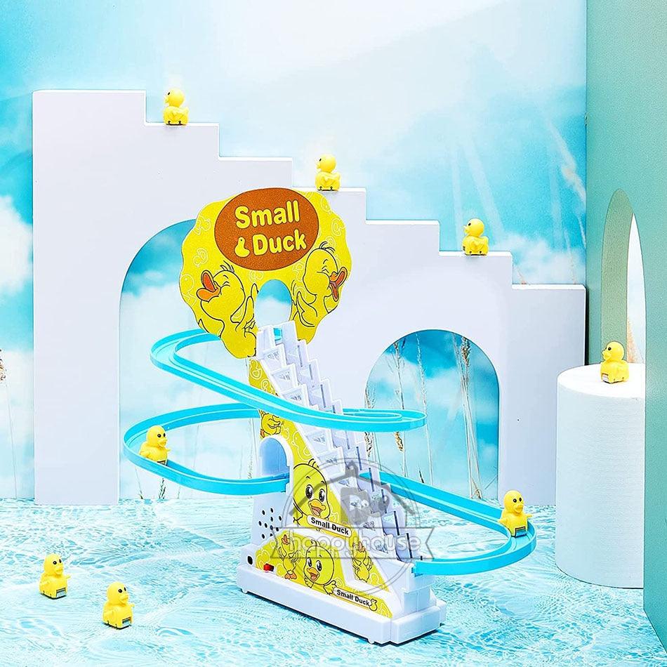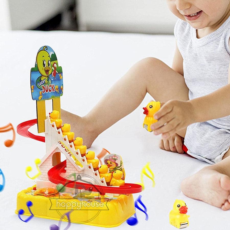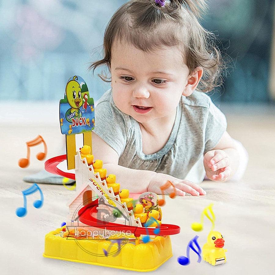 O Conjunto de Brinquedos de Pato é equipado com luzes LED piscantes, o brinquedo tem uma trilha sonora divertida e música animada (com um botão liga/desliga), quando você começa, o pato sobe a escada com a música e depois desliza descendo o escorregador. Seu filho vai adorar assistir a essa fofura! -
