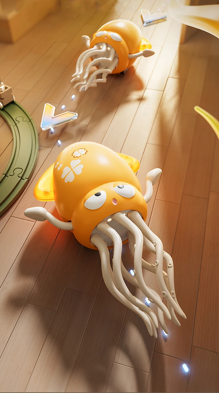 - Ao ser ligado, o polvo começa a se mover sozinho, desviando de obstáculos automaticamente.