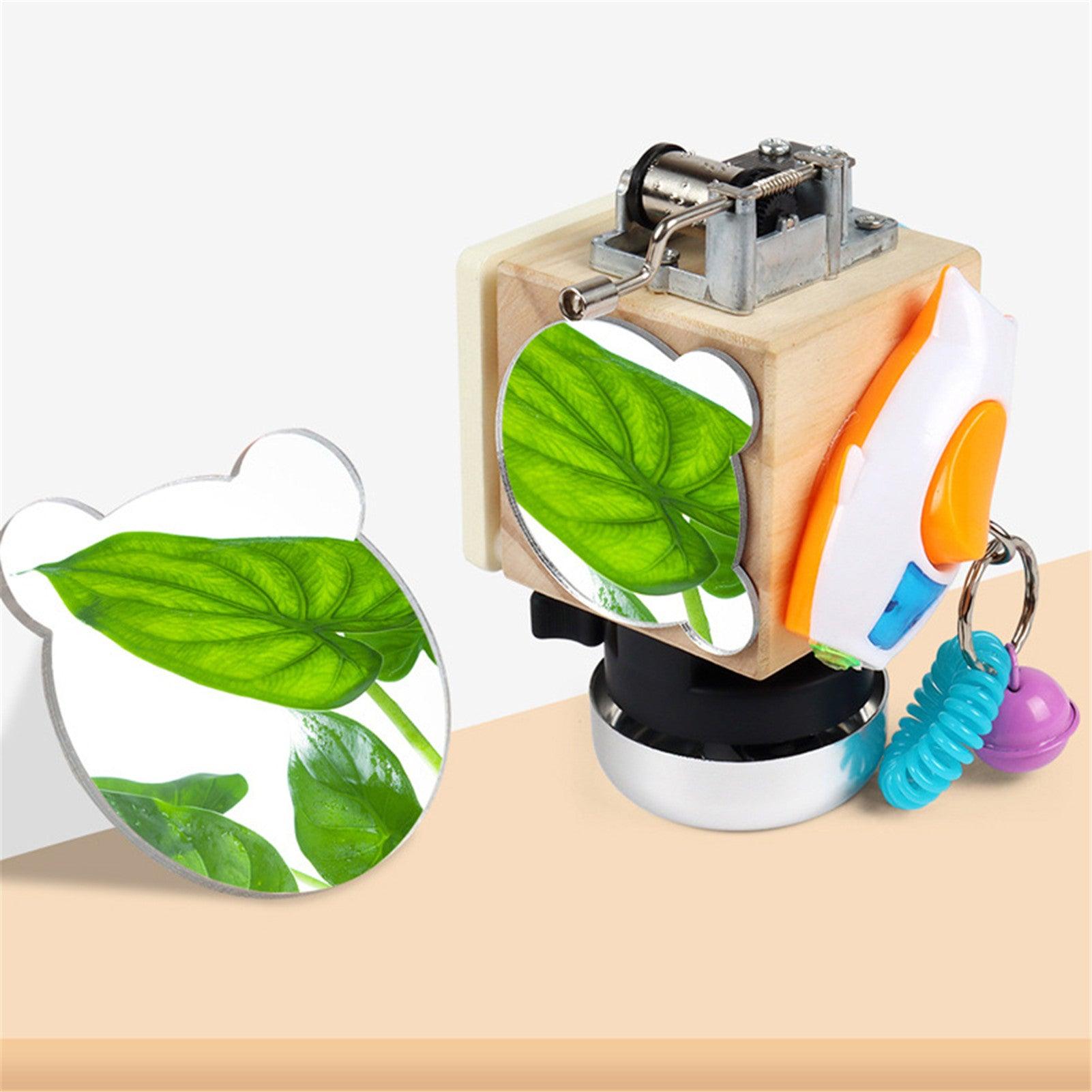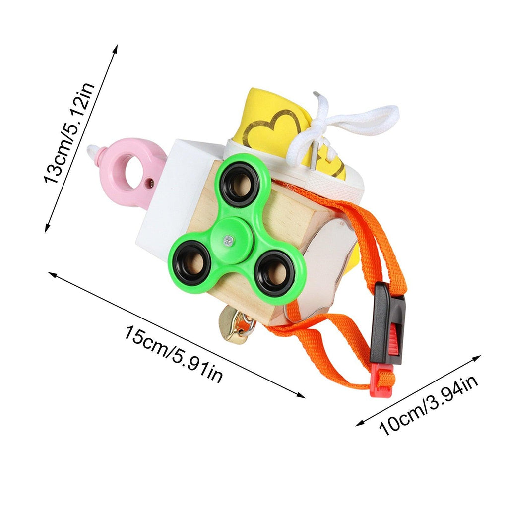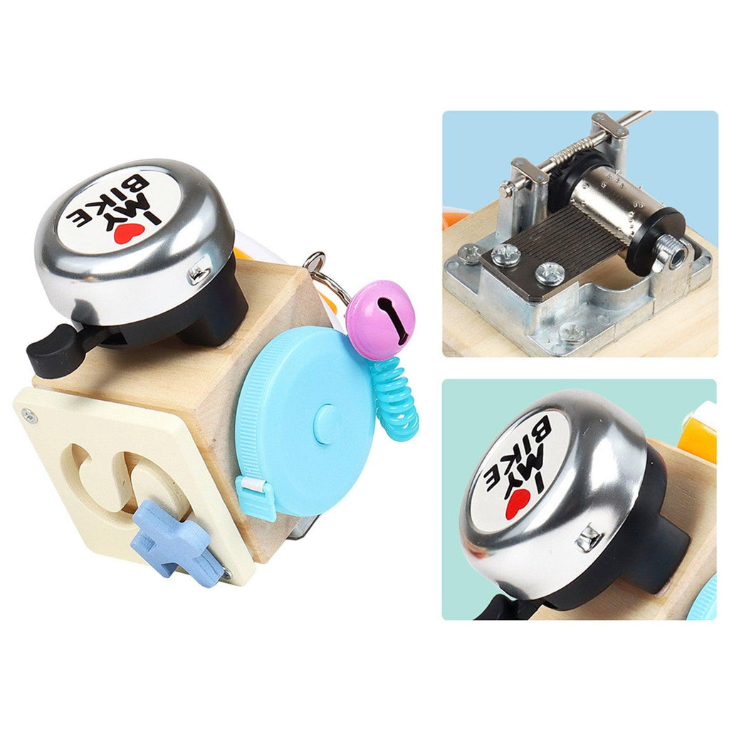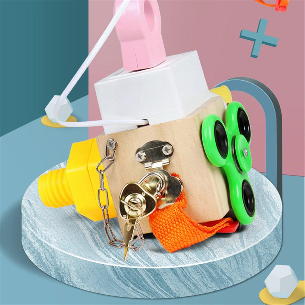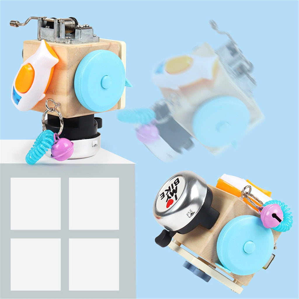 - Brinquedo cognitivo de atividade 7 em 1. Esta caixa ocupada de madeira é uma mistura de giroscópio de ponta de dedo, parafuso de mola, interruptor, roda, tampa de rosca, torneira de água, chave/fechadura. Cada jogabilidade está intimamente relacionada à vida, fazendo com que as crianças aprendam habilidades básicas e desenvolvam suas habilidades cognitivas durante o recreio .